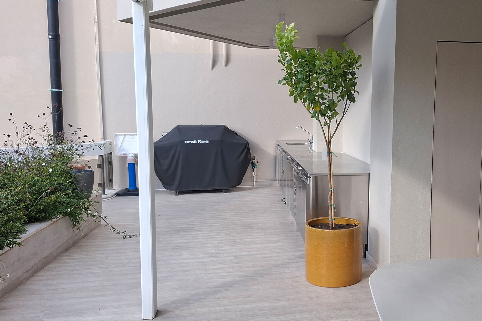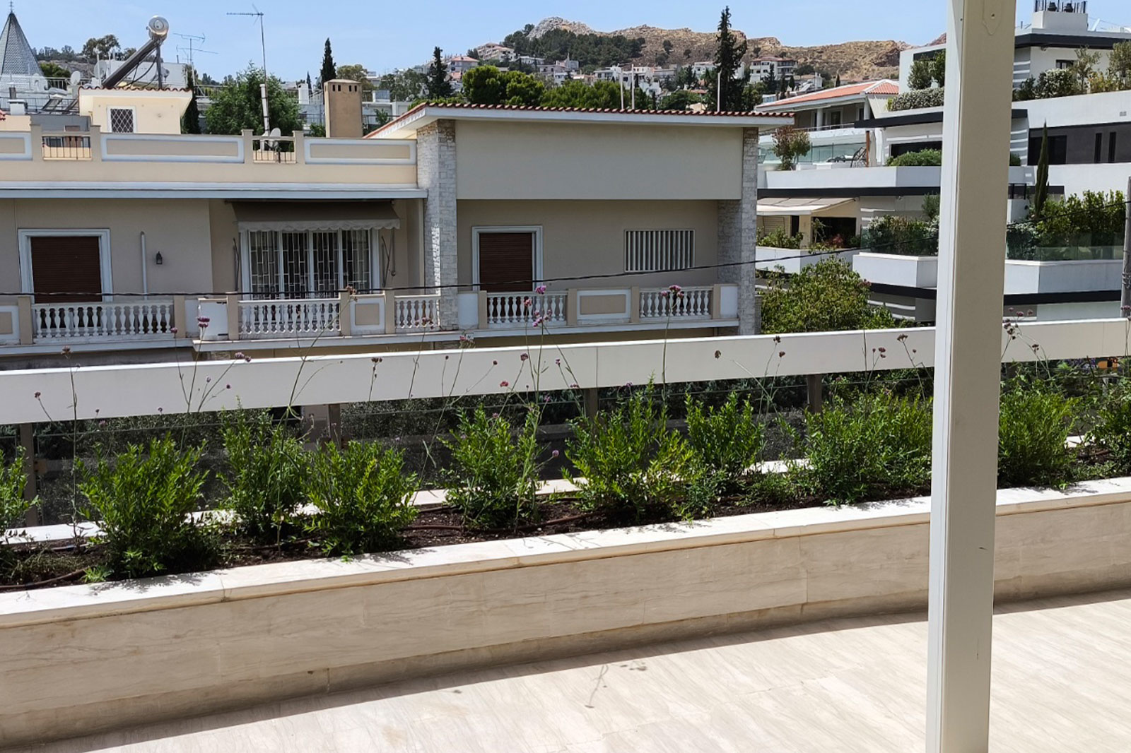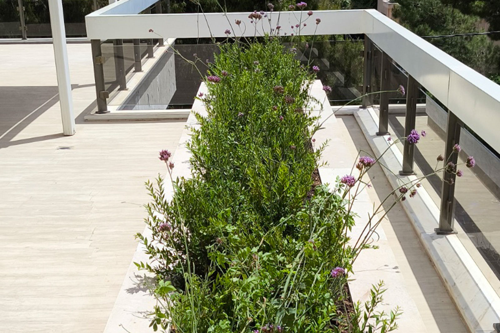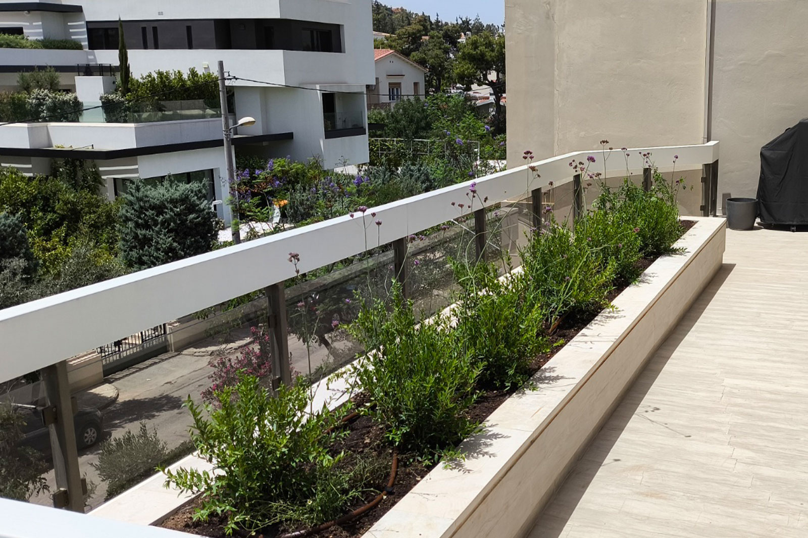 Ο συγκεκριμένος χώρος αναβαθμίστηκε πλήρως με την κατασκευή και τοποθέτηση ζαρντινιέρων, φυτεύσεις που αναδεικνύουν την αισθητική του κήπου και προηγμένα συστήματα αποστράγγισης και άρδευσης που διασφαλίζουν τη σωστή φροντίδα του πρασίνου.